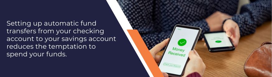 Financial advisors recommend having 3 to 6 months’ worth of living expenses set aside in an account that you could access at any time. If you don’t have an emergency fund, setting up automated transfers into a savings account could help you meet that goal. Many people discover that automatically transferring funds from their checking account to their savings account reduces the temptation to spend them.