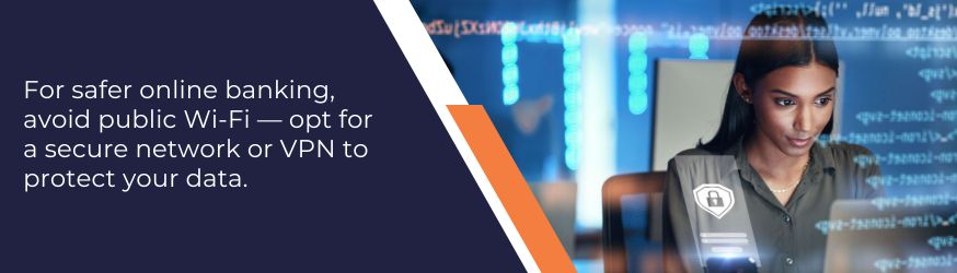 Doing just about anything online comes with a certain amount of risk, and that includes digital banking. We recommend that all our digital banking customers avoid using public Wi-Fi for any kind of banking activity. Cyber criminals have been known to prey on Wi-Fi users, intercepting their signals and capturing their logon credentials for later use.