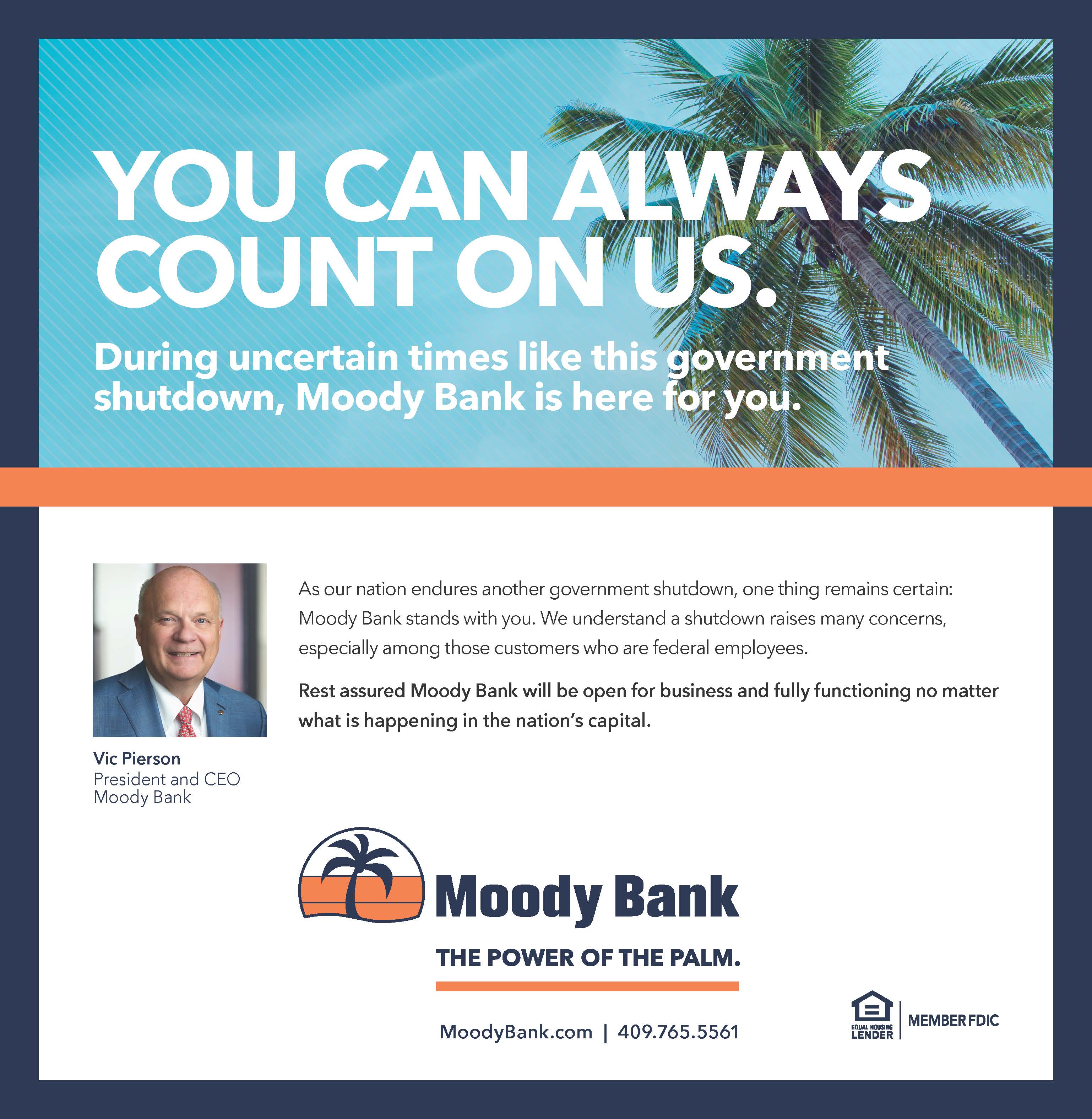 Moody Bank’s operations are not impacted by the shutdown. We remain open, fully operational, and ready to serve you. The banking system is strong, and your FDIC-insured deposits are safe and accessible whenever you need them.